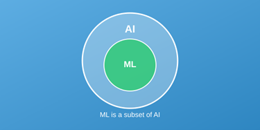 Think of AI as a big circle and ML as a smaller circle inside it. Machine Learning is one of the ways we achieve Artificial Intelligence. In other words, ML is a tool or technique used to create AI systems.